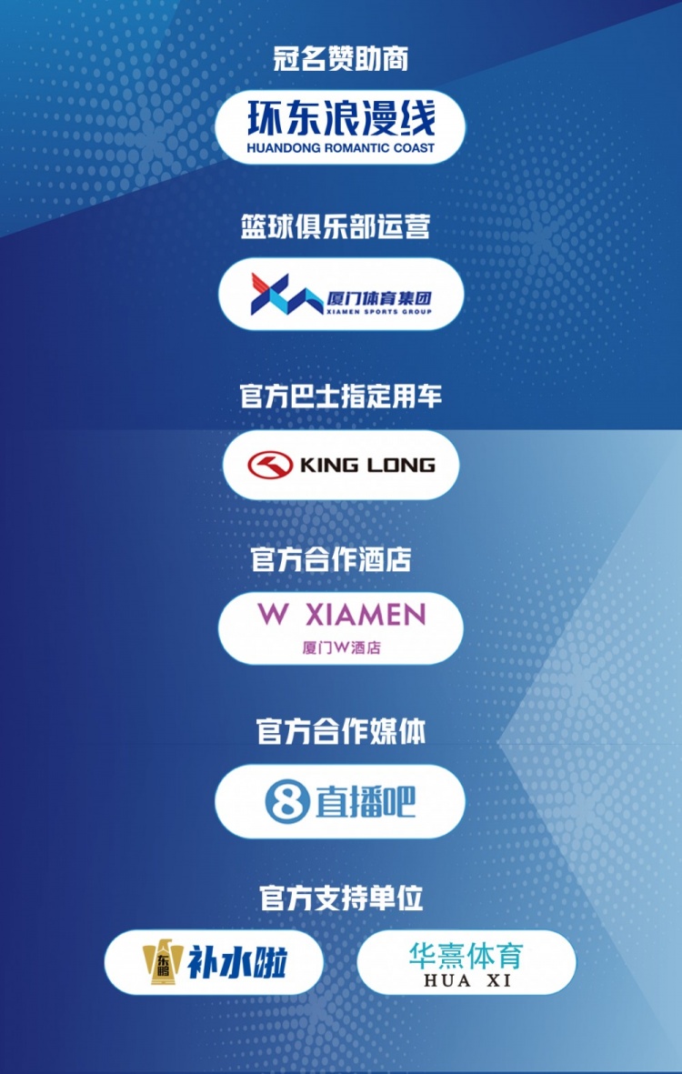 感謝集團(tuán)兄弟公司廈門體育產(chǎn)業(yè)集團(tuán)環(huán)東文旅運(yùn)營有限公司的冠名贊助,感謝廈門金龍集團(tuán)、廈門W酒店、、華熹體育、東鵬特飲對(duì)球隊(duì)的鼎力支持,感謝所有贊助商與幕后團(tuán)隊(duì)的同行!
