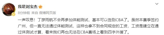 原文寫道:“一聲嘆息!丁彥雨航不會(huì)再參加體能測(cè)試,基本可以告別CBA了。雖然本賽季簽約廣州,但一直無法通過體能測(cè)試,這樣也拿不到合同規(guī)定的工資,工資是建立在通過體測(cè)試才算,看來我們?cè)僖矡o法在CBA賽場(chǎng)上看到四字外援了。 ???”