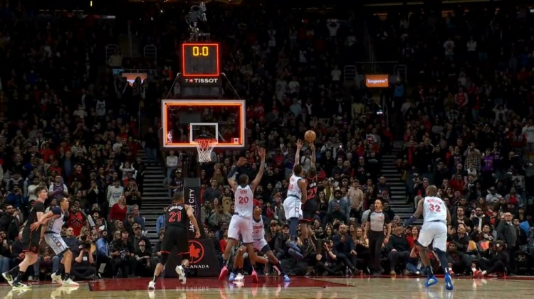 奇才隊垂頭喪氣地站在一旁,希望裁判的審查能取消這個進(jìn)球。當(dāng)裁判做出裁決——謝德在時鐘指向0:00時仍有兩個手指觸球——奇才隊高興地跳了起來,猛龍隊從興奮變?yōu)檎痼@,噪音從喧鬧變?yōu)槔Щ蟮牡驼Z。