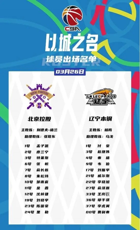 - 北控VS遼寧大名單:廖三寧趙繼偉領銜 弗格在列 韓德君張鎮(zhèn)麟缺陣