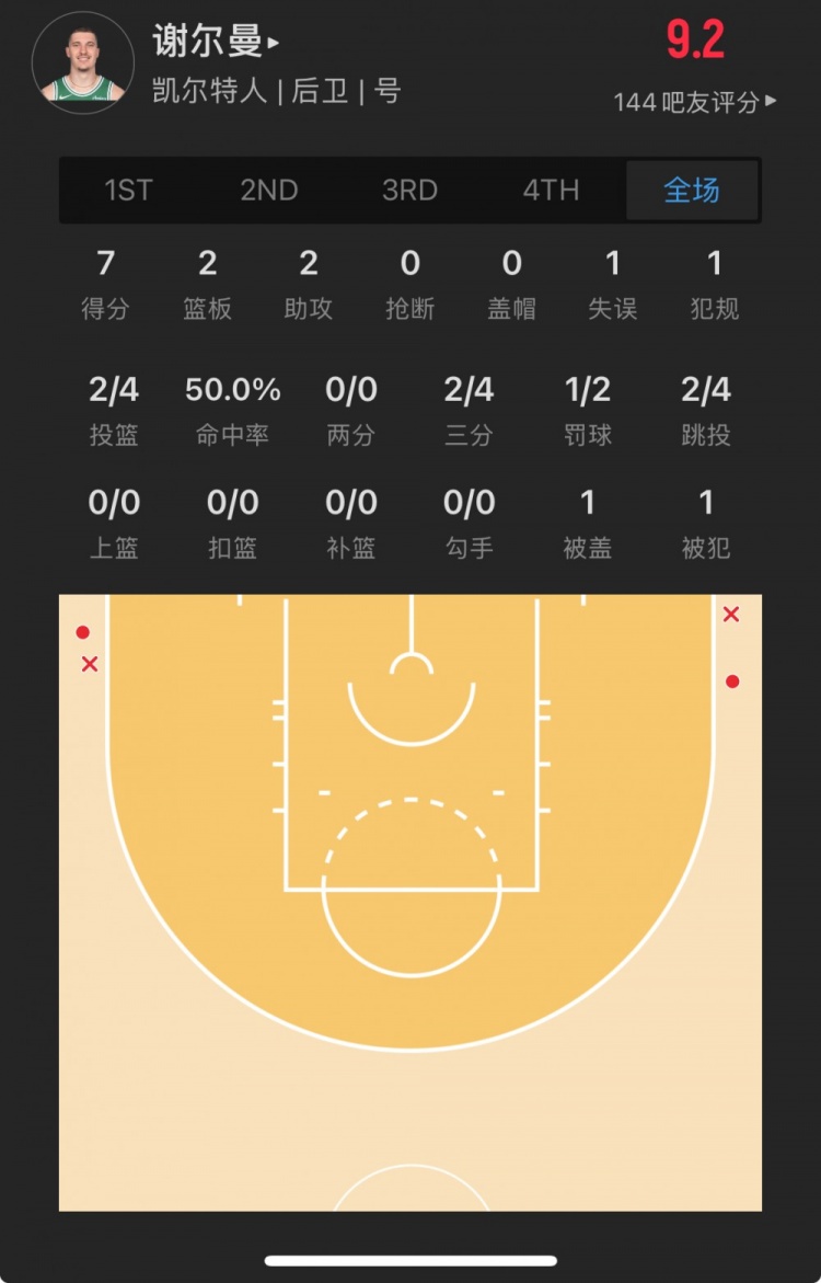 凱爾特人30號秀 貝勒-謝爾曼 登場19.0分鐘
