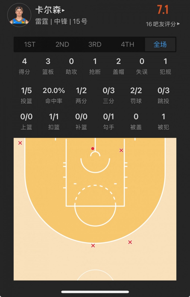 雷霆落選秀 布蘭登-卡爾森 登場12.6分鐘