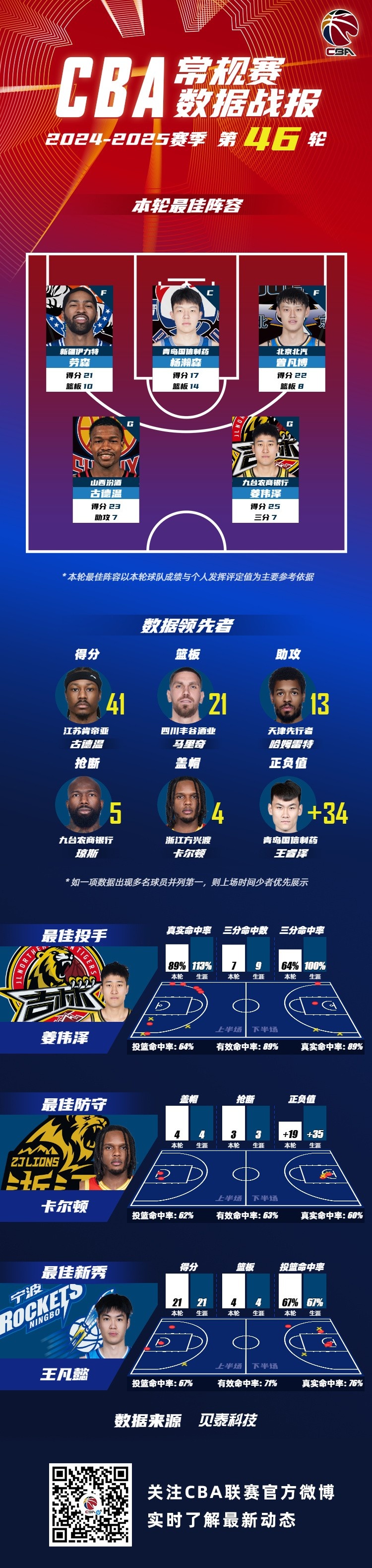 2024-2025賽季CBA聯(lián)賽常規(guī)賽第46輪結(jié)束較量,來自新疆廣匯籃球俱樂部的勞森,青島國信海天籃球俱樂部的楊瀚森,北京首鋼籃球俱樂的曾凡博,山西汾酒職業(yè)籃球俱樂部的古德溫和吉林東北虎男籃的姜偉澤入選CBA聯(lián)賽常規(guī)賽第46輪最佳陣容!