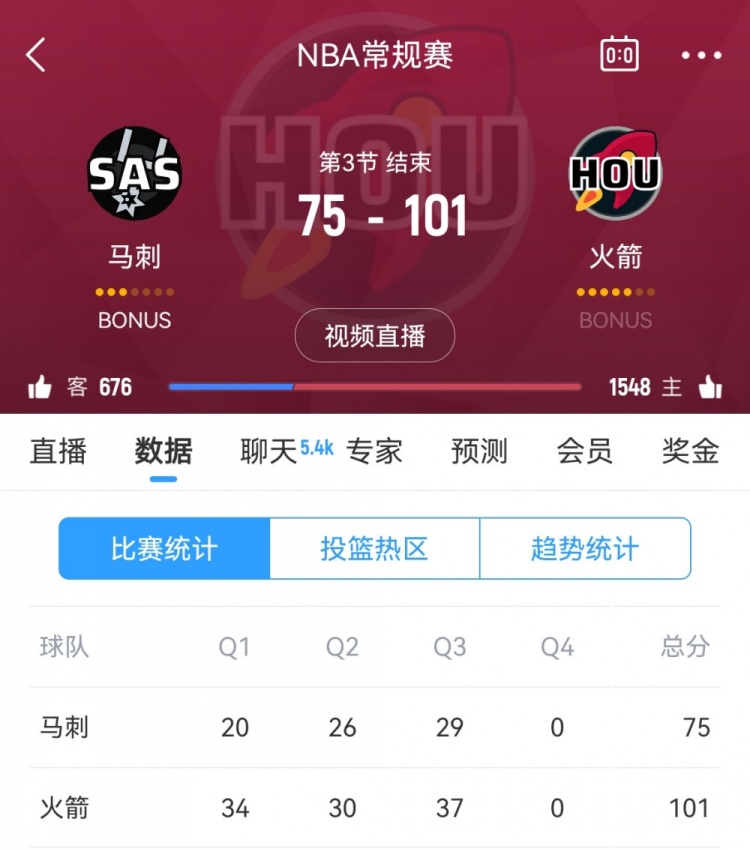 前三節(jié),火箭攻防兩端壓制馬刺,每節(jié)單節(jié)得分均高于對手,三節(jié)打完火箭已獲得26分優(yōu)勢。