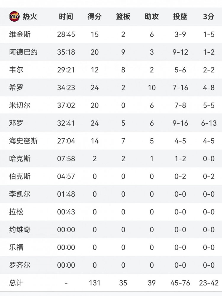 本場比賽,熱火全隊多點(diǎn)開花、共有7人得分上雙、4人得分20+,具體如下:
