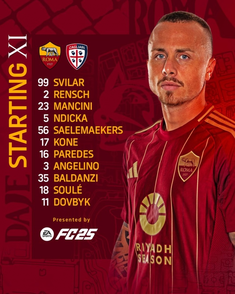 羅馬首發(fā):99-斯維拉爾、2-倫施、23-曼奇尼、5-恩迪卡、56-薩勒馬科爾斯、17-科內(nèi)、16-帕雷德斯、3-安杰利諾、18-蘇萊、35-巴爾丹齊、11-多夫比克