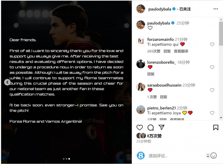 迪巴拉社媒:評(píng)估選擇之后決定接受手術(shù),將為羅馬和阿根廷隊(duì)加油