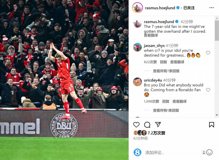 霍伊倫在社交媒體上曬出自己慶祝的照片,配文:“藏在我心里的那個7歲小球迷,進(jìn)球后可能接管了我?!?/p>