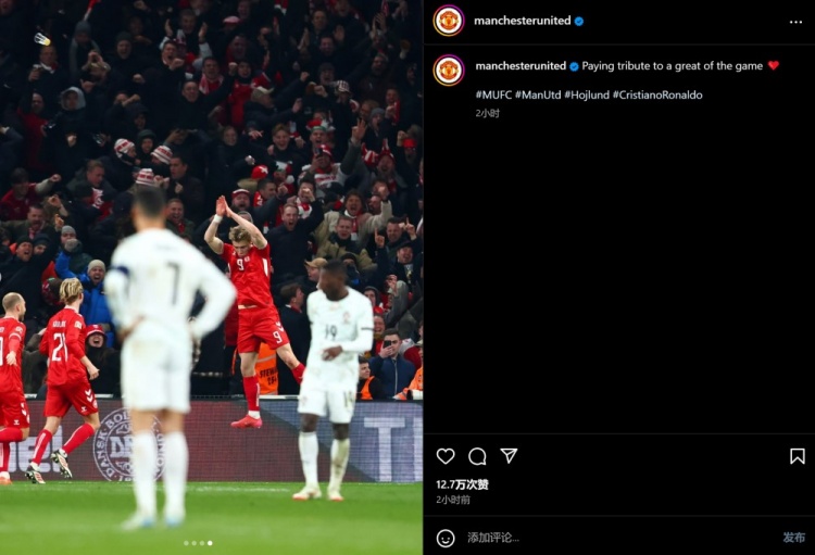 曼聯(lián)官方曬出了霍伊倫在C羅面前慶祝時的照片,并寫道:向偉大球員致敬?。