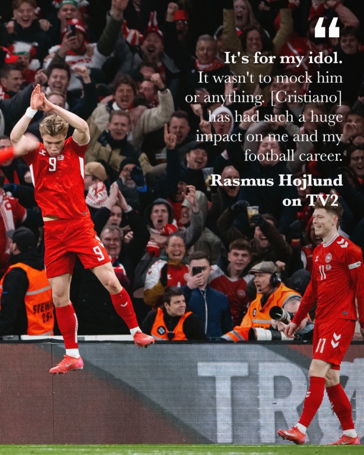 3月21日訊 歐國聯(lián)1/4決賽首回合中,丹麥1-0擊敗葡萄牙,霍伊倫破門后模仿了C羅標志性的Siu慶祝動作。