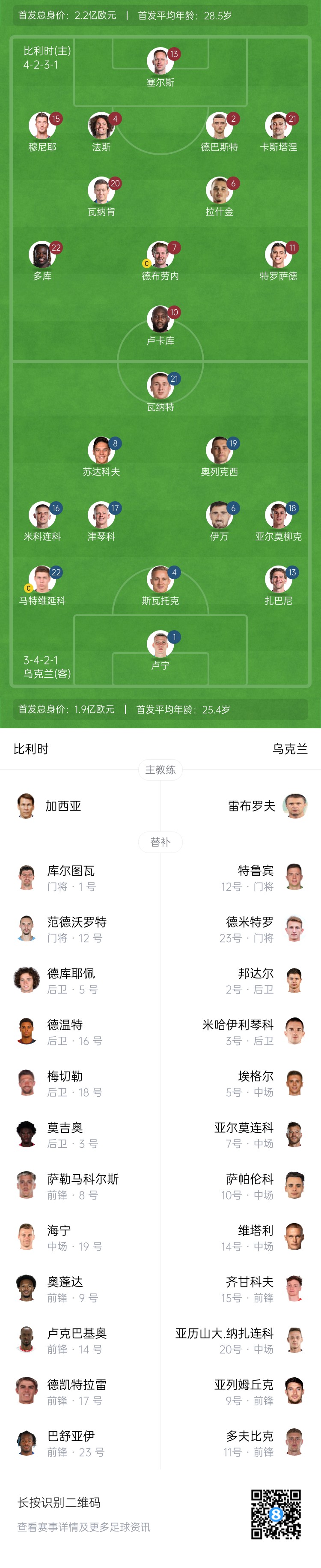 歐國(guó)聯(lián)-比利時(shí)vs烏克蘭首發(fā):盧卡庫(kù)、德布勞內(nèi)先發(fā),多庫(kù)出戰(zhàn)