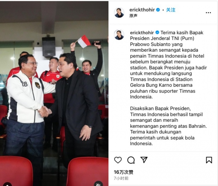 賽后印尼足協(xié)主席托希爾更新社媒,曬出了印尼總統(tǒng)蘇比延多親臨現(xiàn)場觀戰(zhàn)的Vlog,并配文寫道: