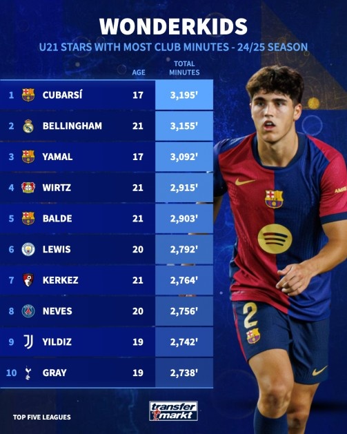U21球員出場(chǎng)時(shí)間榜:17歲庫(kù)巴西3195分鐘居首,貝林厄姆2亞馬爾3