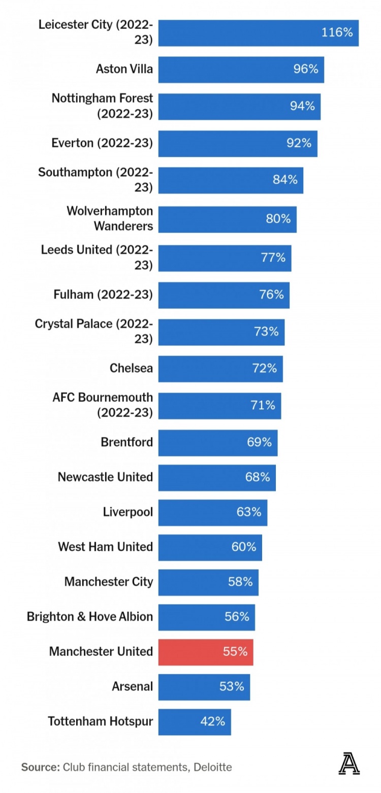 事實上,曼聯(lián)的工資收入比非常健康,是英超中工資占收入比例最低的俱樂部之一,多年來一直如此(如下圖)。問題在于,曼聯(lián)最好的球員、高薪的球員經(jīng)常上不了場。以盧克-肖為例,據(jù)匿名消息人士透露,這名球員在2023年4月同意續(xù)約4年,周薪約20萬鎊,還有額外獎金。與其他曼聯(lián)球員一樣,如果球隊無緣歐冠,待遇會降低,但據(jù)說減薪幅度低于球隊標(biāo)準(zhǔn)的25%。