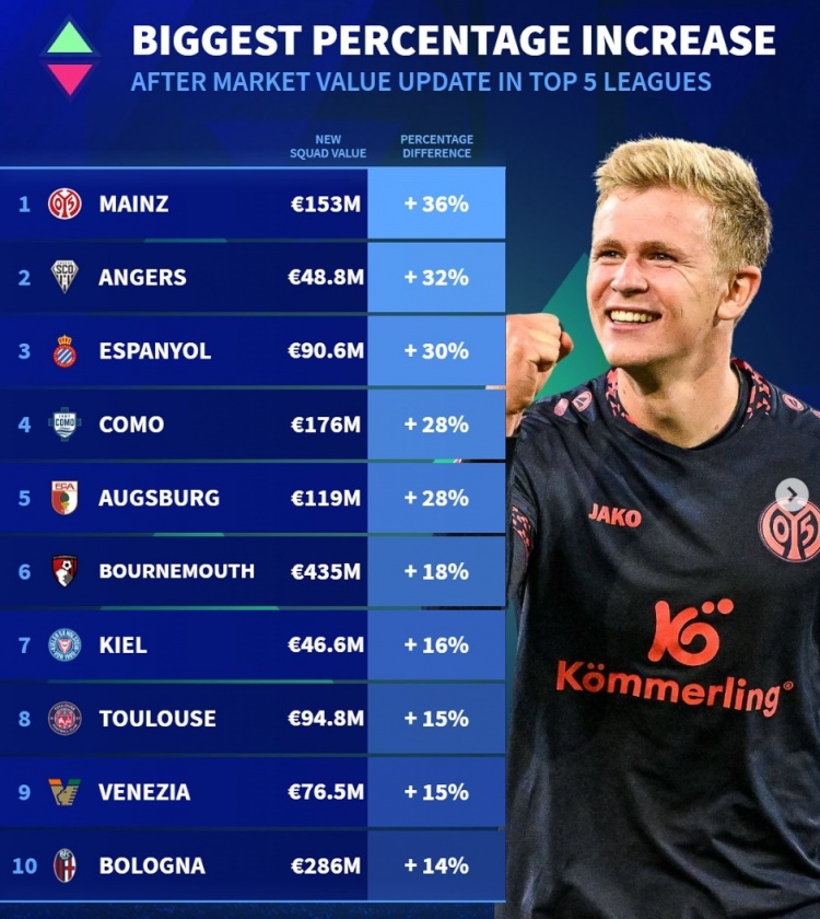 - 五大聯(lián)賽球隊身價升值比例:美因茨漲36%,博洛尼亞&伯恩茅斯在列