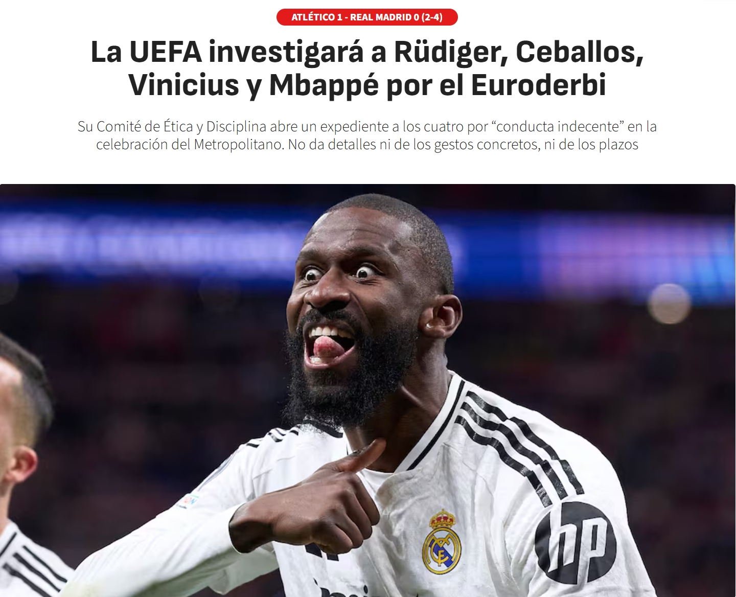 03月28日訊 歐足聯(lián)官方昨日發(fā)布官方公告,宣布對姆巴佩、維尼修斯、呂迪格、塞巴略斯4名皇馬球員在歐冠對馬競賽后的不當行為展開進一步調(diào)查?!栋⑺箞蟆吠嘎读嘶蜀R俱樂部方面對此的立場。