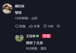 隨后他在U20國足的隊友蒯紀(jì)聞留言寫道:“夠快?!蓖踱晽潉t回復(fù)稱:“想你了兄弟?!?/p>