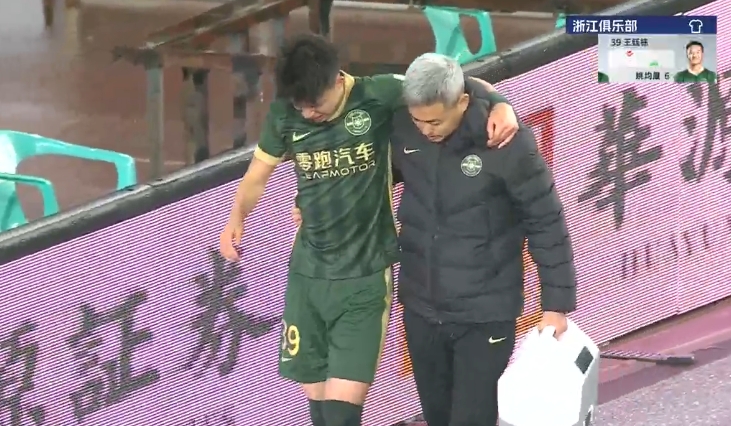 隨后隊醫(yī)進場簡單治療,擔(dān)架進場將王鈺棟抬離球場。最終王鈺棟無法堅持,被姚均晟換下。