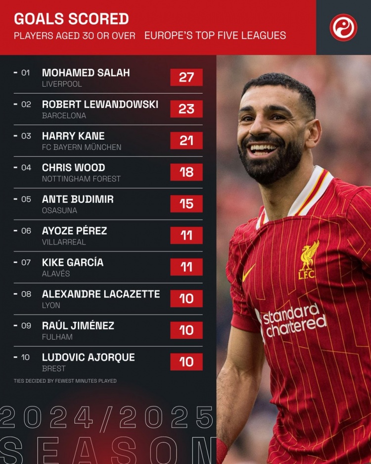 - 本賽季五大聯(lián)賽僅3名30+球員打進(jìn)20+聯(lián)賽進(jìn)球:薩拉赫、萊萬(wàn)、凱恩