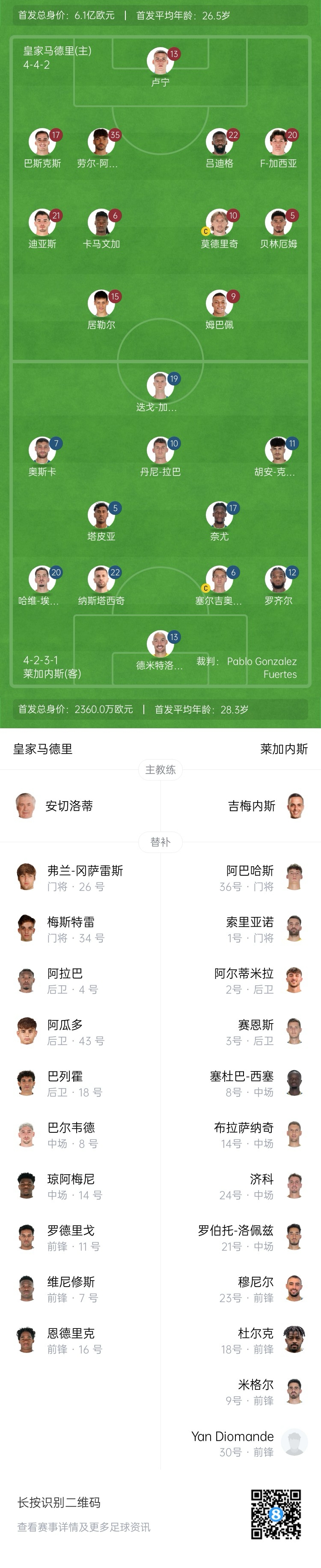 - 皇馬vs萊加內(nèi)斯首發(fā):姆巴佩領(lǐng)銜 維尼修斯替補(bǔ) 居勒爾&魔笛先發(fā)
