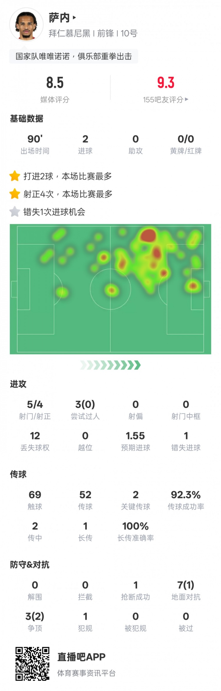 - 薩內(nèi)本場數(shù)據(jù):2進(jìn)球2關(guān)鍵傳球&錯失1次進(jìn)球機會,評分8.5