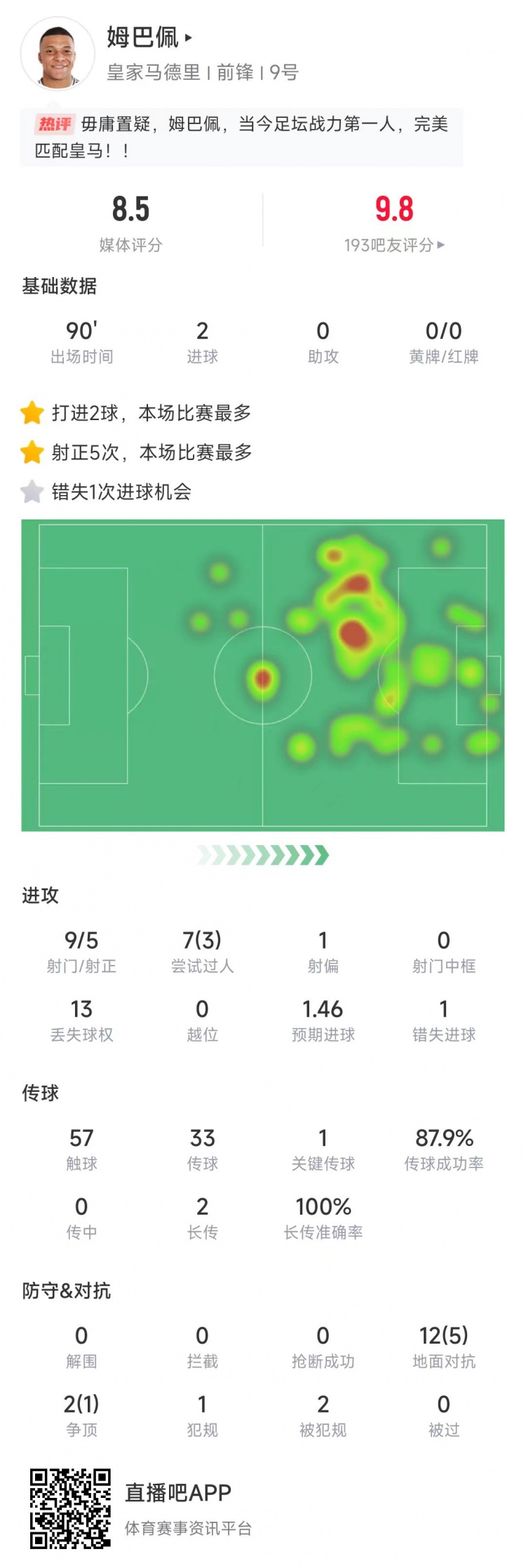 - 雙響建功!姆巴佩本賽季西甲22球3助參與25球,追平萊萬23球2助