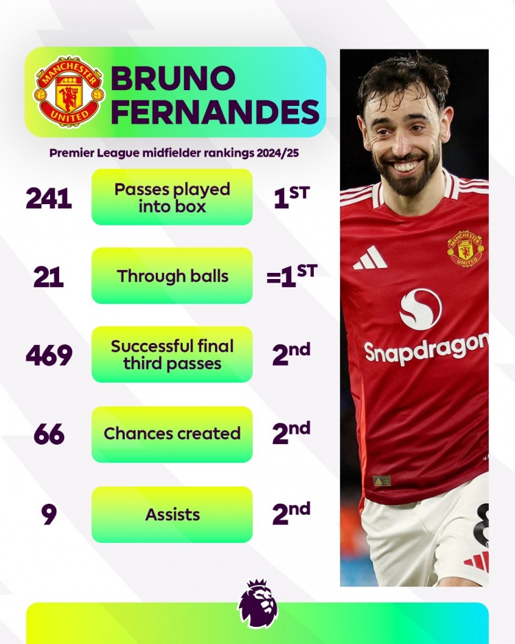 - 曼聯(lián)大腿!B費(fèi)本賽季傳入禁區(qū)、直塞英超中場最多,助攻第二多