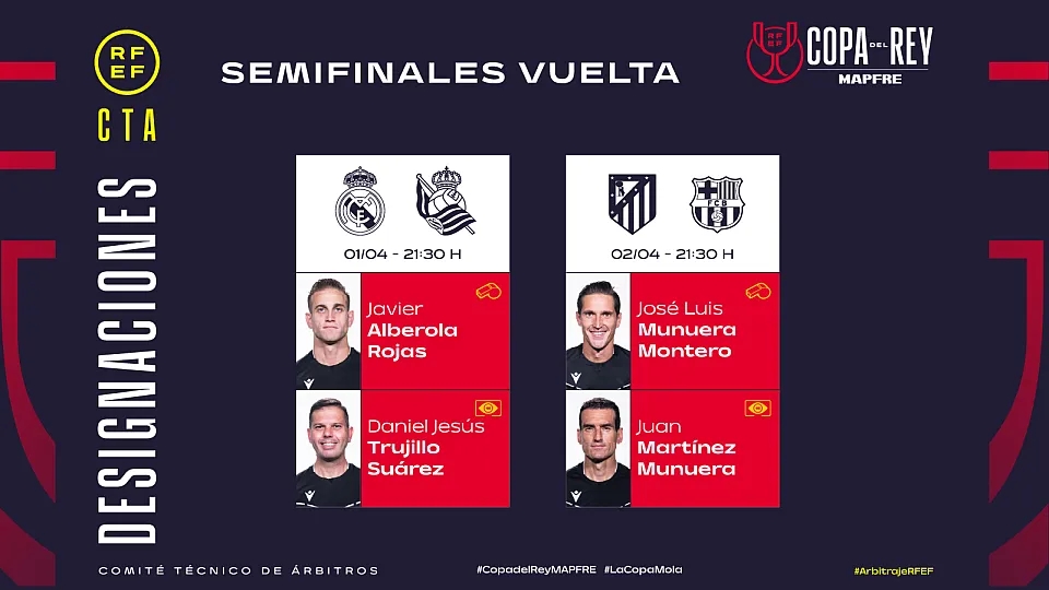 03月31日訊 西班牙足協(xié)公布了國王杯半決賽次回合的裁判名單。首回合,皇馬1-0皇家社會,巴薩4-4馬競。次回合的比賽將于本周三和周四進行。