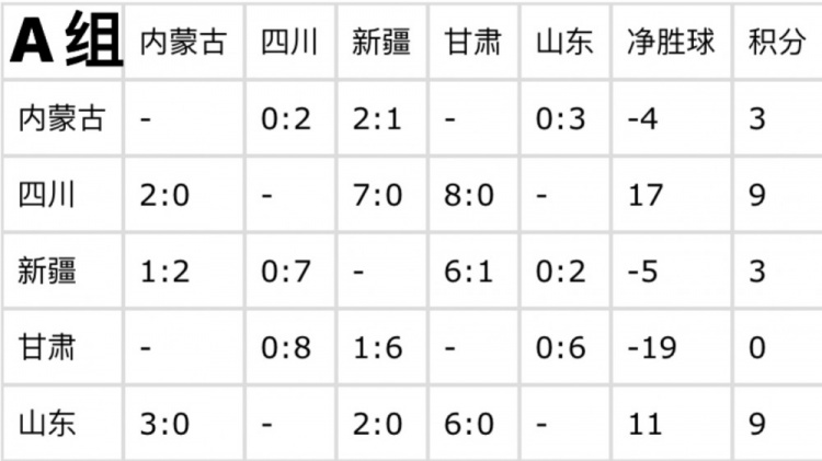 目前,四川和山東同積9分,憑借出色的表現(xiàn)已提前鎖定出線(xiàn)資格。在凈勝球方面,四川以17個(gè)凈勝球領(lǐng)先,山東凈勝球?yàn)?1個(gè)。內(nèi)蒙古和新疆均積3分,甘肅積0分已確定無(wú)緣出線(xiàn)。最后一輪比賽,雖無(wú)直接影響出線(xiàn)的關(guān)鍵對(duì)決,但各隊(duì)仍會(huì)為榮譽(yù)而戰(zhàn),力求以更好的成績(jī)結(jié)束資格賽階段。