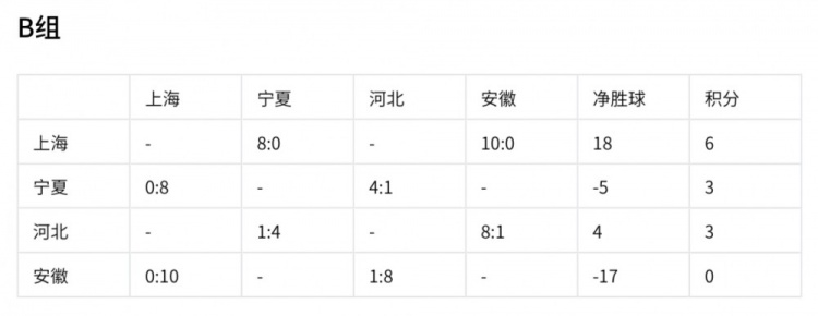 上海隊(duì)以6分、18個(gè)凈勝球的優(yōu)勢(shì)提前出線(xiàn)。寧夏和河北同積3分,寧夏凈勝球?yàn)?-5,河北凈勝球?yàn)?,安徽積0分已出局。最后一輪比賽,各隊(duì)的表現(xiàn)將決定最終排名,寧夏和河北都渴望在最后一戰(zhàn)中爭(zhēng)取更好名次。