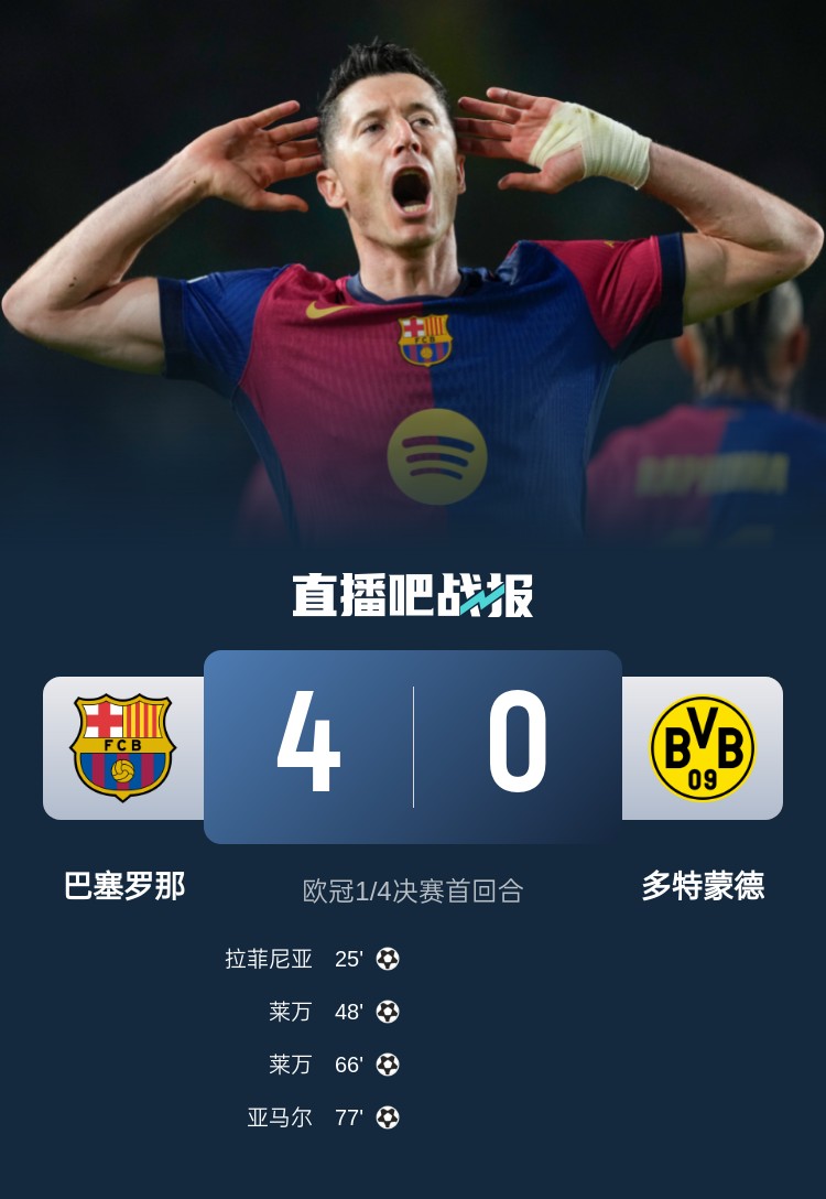 歐冠8強(qiáng)首回合,巴薩4-0大勝多特!萊萬(wàn)雙響,亞馬爾、拉菲尼亞破門!懸念已無了嗎?
