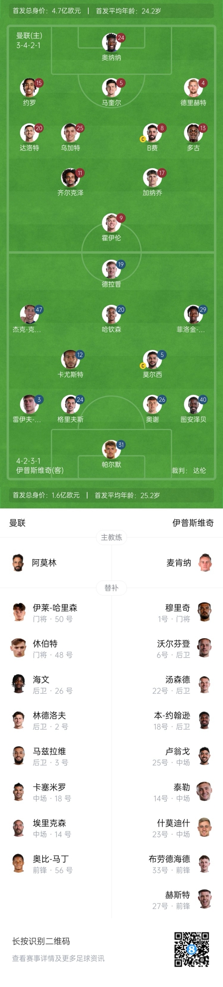 曼聯(lián)替補(bǔ):48-格拉奇克、50-哈里森、2-林德洛夫、3-馬茲拉維、14-埃里克森、18-卡塞米羅、26-海文、56-奧比-馬丁