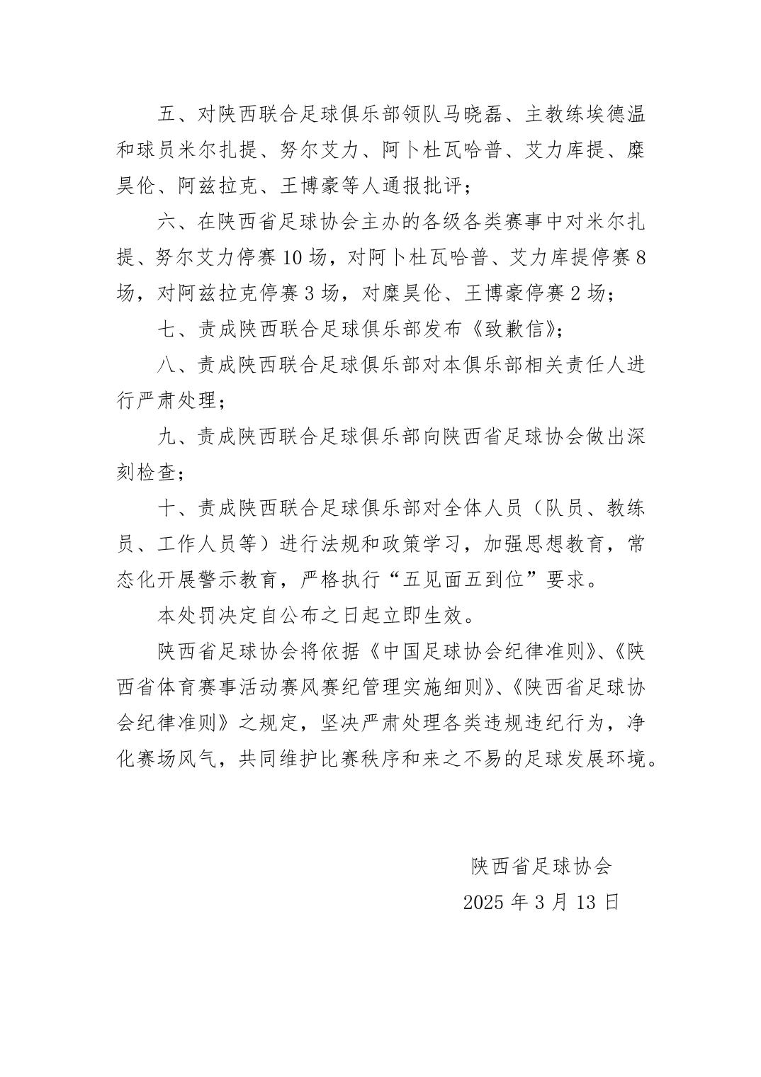 8、責(zé)成陜西聯(lián)合足球俱樂部對本俱樂部相關(guān)責(zé)任人進行嚴肅處理。